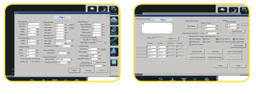 Полностью автоматические трафаретные принтеры серии SP оснащены высокоточной серво приводной механикой и системой машинного зрения для быстрого и точного совмещения платы и трафарета. Разрешение сервоприводов достигает +/- 0,005 мм, а операция совмещения занимает менее 7 с. Принтеры позволяют работать с платами с минимальными размерами контактных площадок под чип-компоненты 0201 (0,6 х 0,3 мм) и микросхемы с шагом выводов 0,3 мм. Удобный пользовательский интерфейс позволяет легко задавать и корректировать ключевые параметры нанесения: размеры платы и рамки с трафаретом, высоту давление и скорость прохода ракеля, периодичность автоматической очистки и т. д.