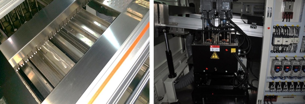 Процесс управляется мощными высокотемпературными моторами, прокачивающими припой через ванну из титанового сплава,что обеспечивает долгий срок службы даже в экстремальных условиях. Прецизионная моторизированная система отвечает за два ключевых действия: плавное вертикальное перемещение ванны для точной настройки высоты и формы волны припоя и горизонтальное выдвижение для быстрого и безопасного доступа к ванне при обслуживании или смене припоя.