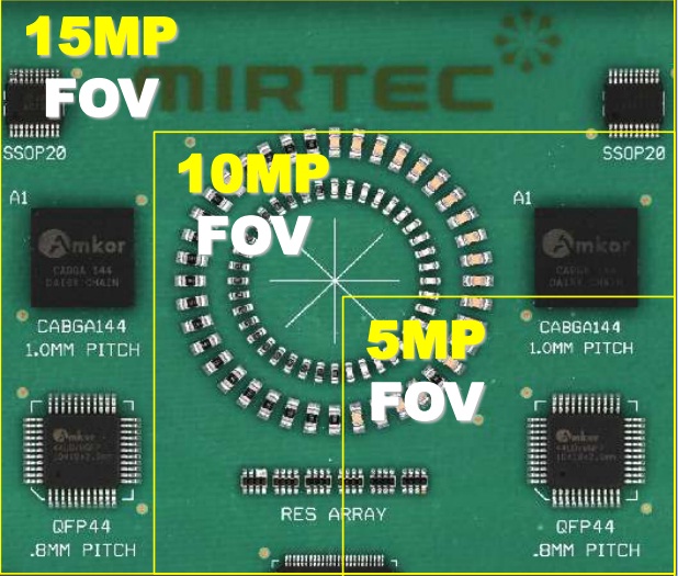 Стоит также упомянуть и о 15-мегапиксельной камере собственного производства компании Mirtec система, которая позволяет увеличить скорость проверки в 2,5 раза (по отношению к аналогичным системам с 5-мегапиксельной камерами – рис. 4). Это стало возможно благодаря увеличению размеров захватываемого изображения камерой, что позволяет одну и ту же печатную плату проинспектировать с меньшим числом снимков. При этом увеличение скорости проверки ни как не отражается на качестве получаемого изображения, а это несомненно является важнейшим параметром для любой системы АОИ.