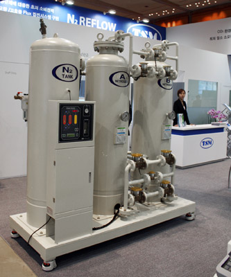 80% электронных производств в Южной Корее используют технологию оплавления паяльной пасты в азотной среде. На стенде компании TSM были представлены мобильные азотные генераторы, рассчитанные на 1 печь, а также промышленные генераторы, способные обеспечивать азотом сразу несколько производственных линий.